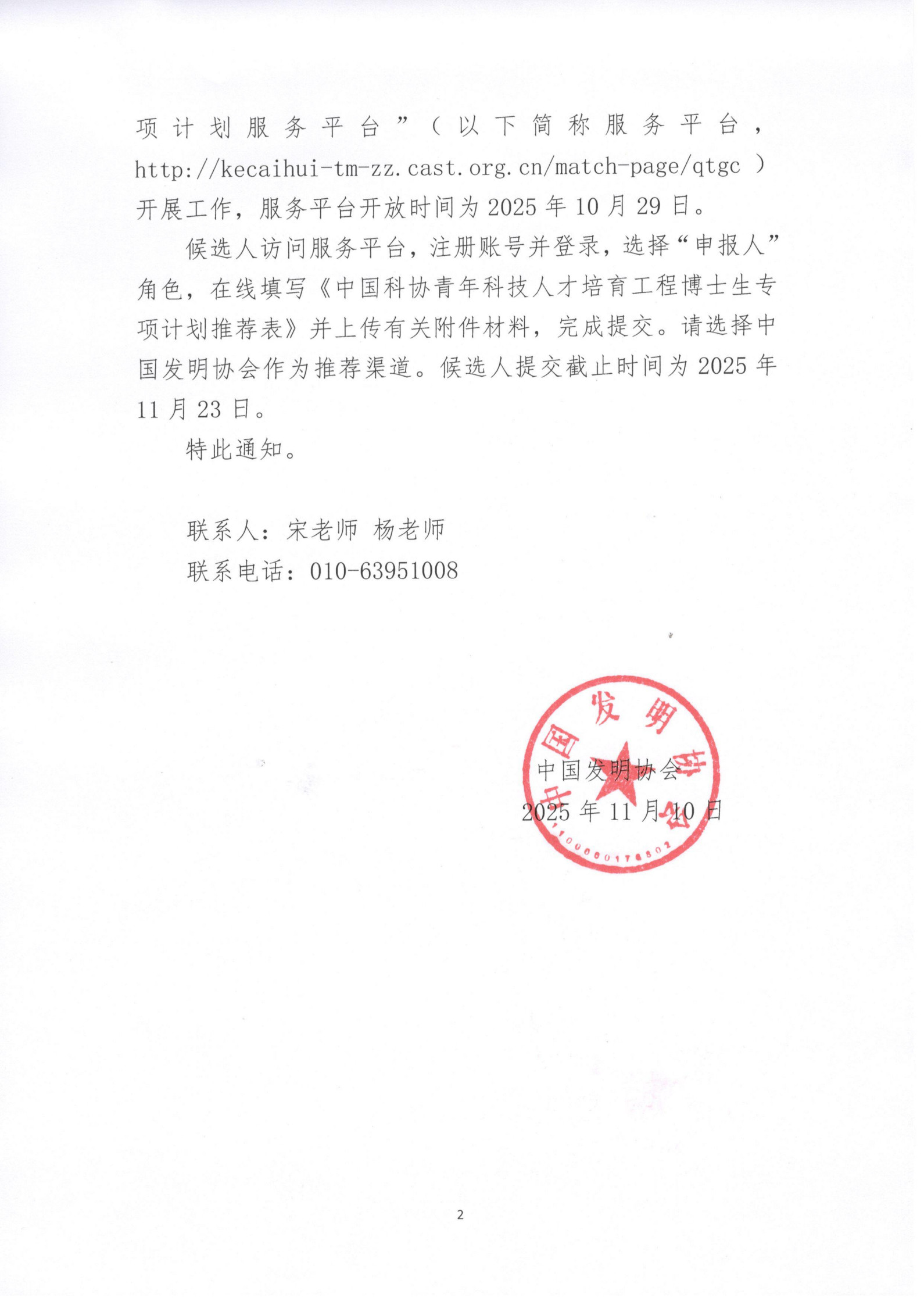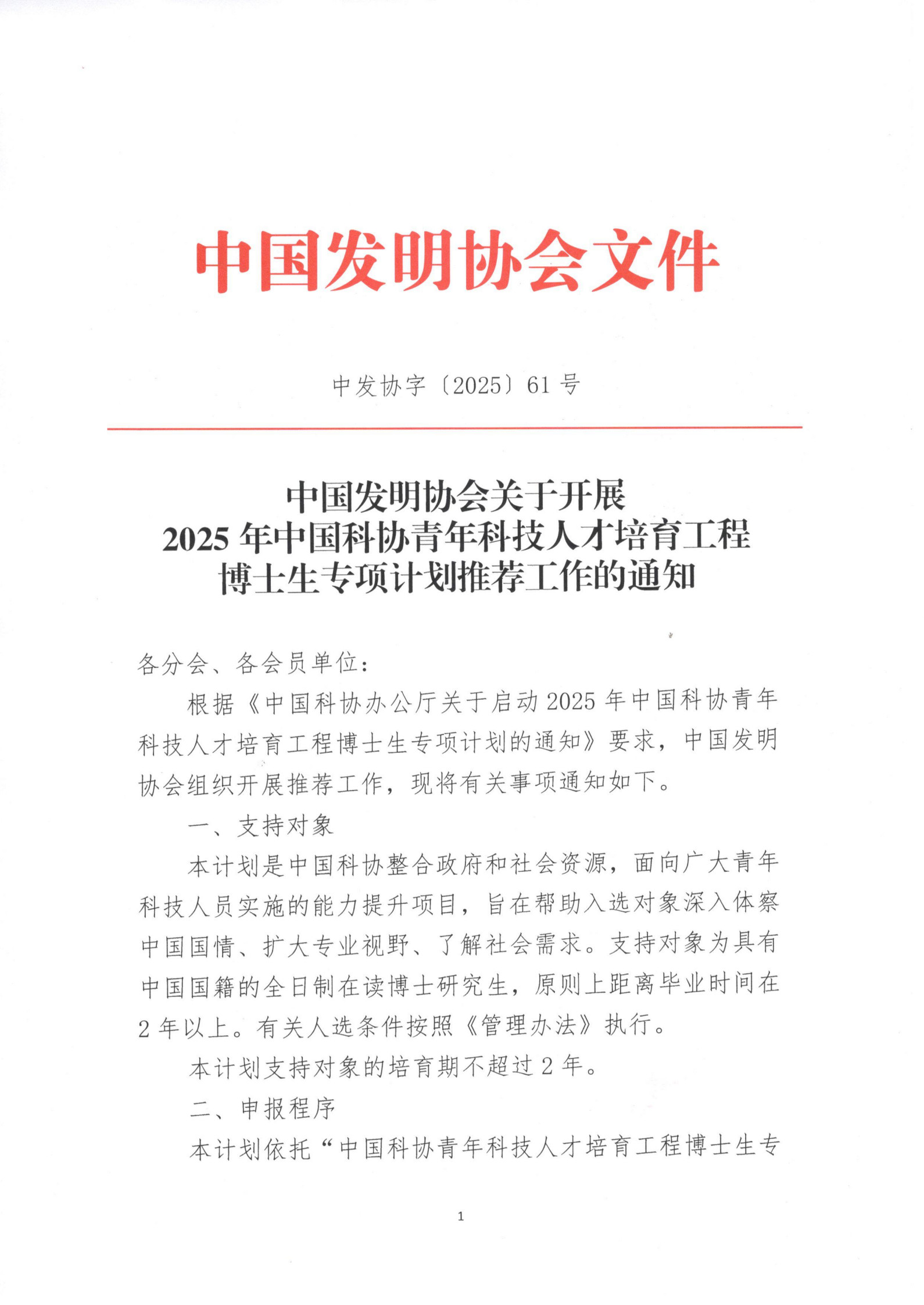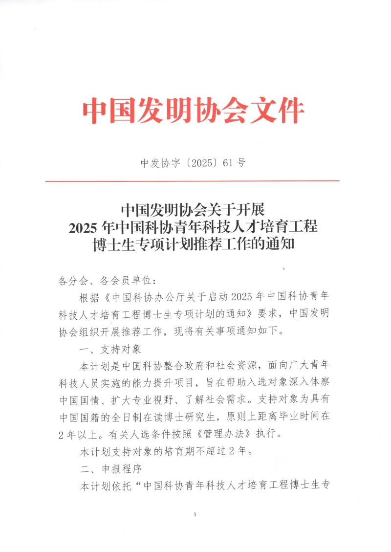 中国发明协会关于开展2025年中国科协青年科技人才培育工程博士生专项计划推荐工作的通知
