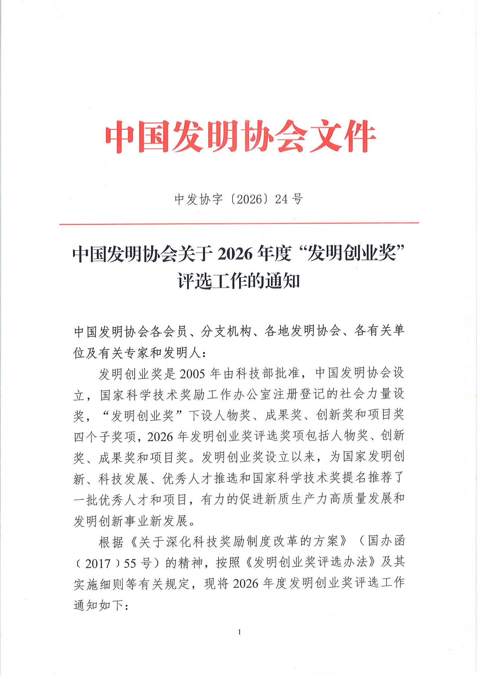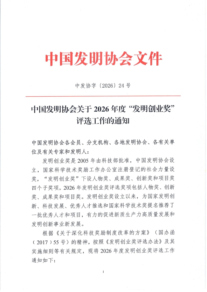 中国发明协会关于2026年度“发明创业奖”评选工作的通知