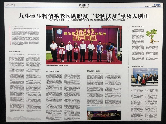 2012年,在湖北省老区建设促进会的支持、促进下,九生堂公司与麻城市政府签署项目投资协议:将公司董事长邹远东价值2700万的“葛根肽的制备方法和用途”发明专利(专利号:ZL200810166945.5)落户在大别山革命老区麻城市木子店镇,并建设葛根肽饮品生产基地。该生产基地总投资5000多万元(其中专利费2700万,现金2300多万),2015年6月建成投产后成为木子店镇第一个现代化工业企业,所用主要原材料野生葛根全部在当地采购,工人也全部在当地招聘。