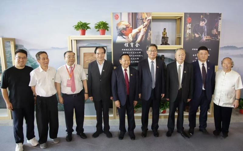 与会领导嘉宾同神雕铜艺第六代传承人程育全合影留念