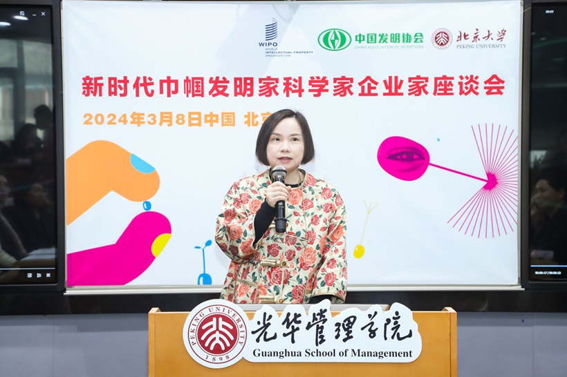 2024年3月8日,“三八”国际妇女节当日,中国发明协会与世界知识产权组织(WIPO)中国办事处、北京大学联合举办了第四届“新时代巾帼发明家科学家企业家座谈会”。座谈会在北京大学光华管理学院2号楼举行,二十多位来自有关单位、高校、科研机构、企业的发明家、科学家、企业家和杰出女性科技工作者汇聚一堂,分享了个人和团队在创新创业创造中的故事、经历、经验和感悟等,并就促进互助学习共进、鼓励更多女性投身科技创新创造提出对策建议与思考。